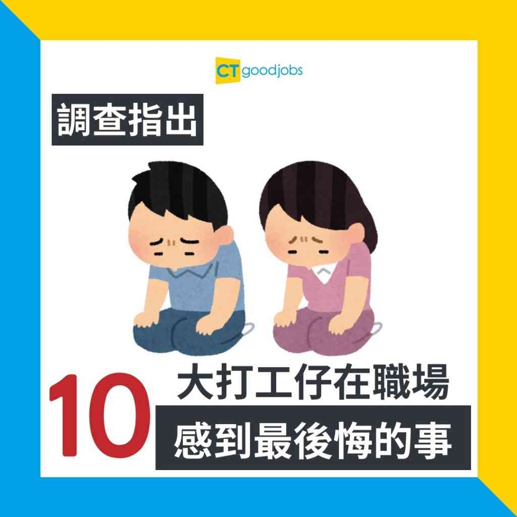 受訪的打工仔中,有66%人有工作相關的遺憾。根據調查,打工仔感到後悔的原因包括:在職涯上沒有轉變(44%)、在會議中說話(38%)、離職(38%)及帶着問題去找HR(34%) 。