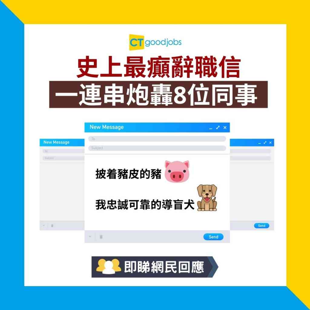 在電郵内,他炮轟同事是「披着豬皮的豬」和「我忠誠可靠的導盲犬」。樓主表示:「其實佢平時都癲癲哋,臨走冇啦啦整個核彈,睇字都覺得尷尬,應該係我見過最癲嘅email。」