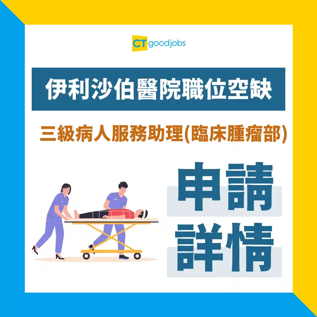 伊利沙伯醫院最近有新職位空缺,現正招募臨床腫瘤部的三級病人服務助理,月薪最高$19,592,主要負責協助推運流動X-光機,為病人提供適切的協助及關顧等。假如你有興趣加入伊利沙伯醫院成為三級病人服務助理(臨床腫瘤部),可留意以下的入職要求、職責及申請詳情。