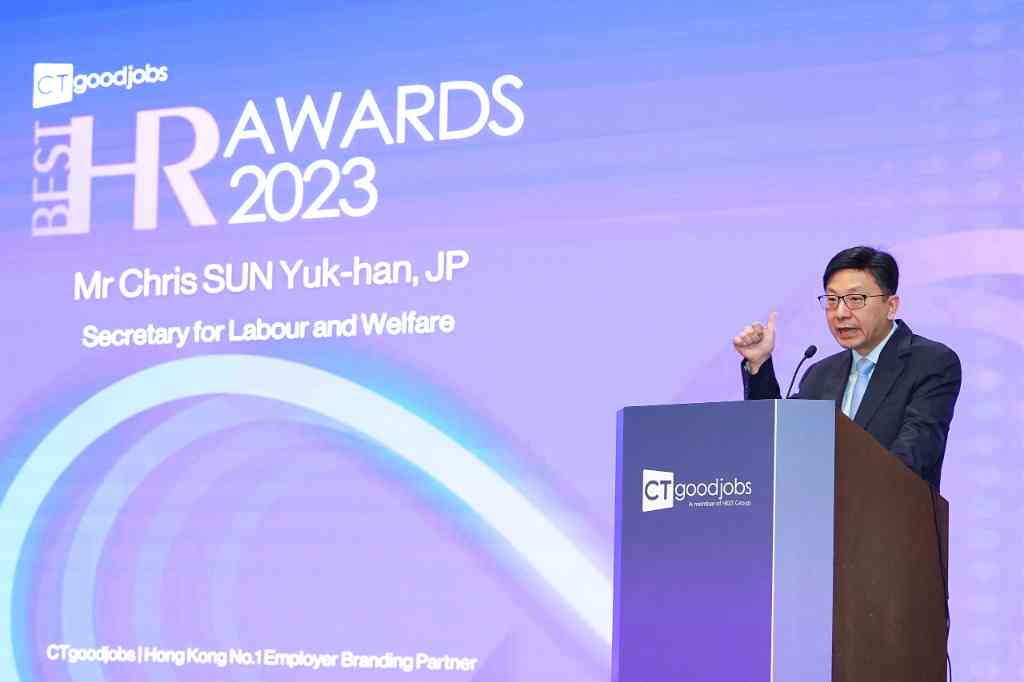 勞工及福利局局長孫玉菡先生擔任上午「CTgoodjobs Best HR Awards頒獎典禮2023」的主禮嘉賓,他致辭時表示, 香港過去一年積極搶人才,打開人才大門,期望推動疫後經濟復甦,歡迎全球人才匯聚香港,發揮所長。同時,香港作為粵港澳大灣區的龍頭城市,積極發揮地區相對優勢,吸引更多人才,來港發展事業。孫局長預告,來年港府在人力資源管理上有三大舉措,包括舉辦「全球人才高峰會暨粵港澳大灣區人才高質量發展大會」,以聯繫祖國,面向世界,激發全球人才更多創新思維。其次,港府亦將研究修例,全方位檢討僱員再培訓局的服務範圍、調整培訓策略和營運模式,一方面提升本地人力的技能,另一方面更好配合香港現今和未來的發展需要;由於上一次針對僱員再培訓局的大型檢討已是2008年,但現時社會對人才的需求已大為不同,大專生人數已佔勞動人口約45%,調整培訓模式可提升更多中年人士的工作技能,協助他們轉型。另外,港府自今年暑假起開展新一輪人力資源推算,加強質性資料及數據的收集和分析,與業界進行更廣泛及深入的訪談,以涵蓋「八大中心」下的重點產業。